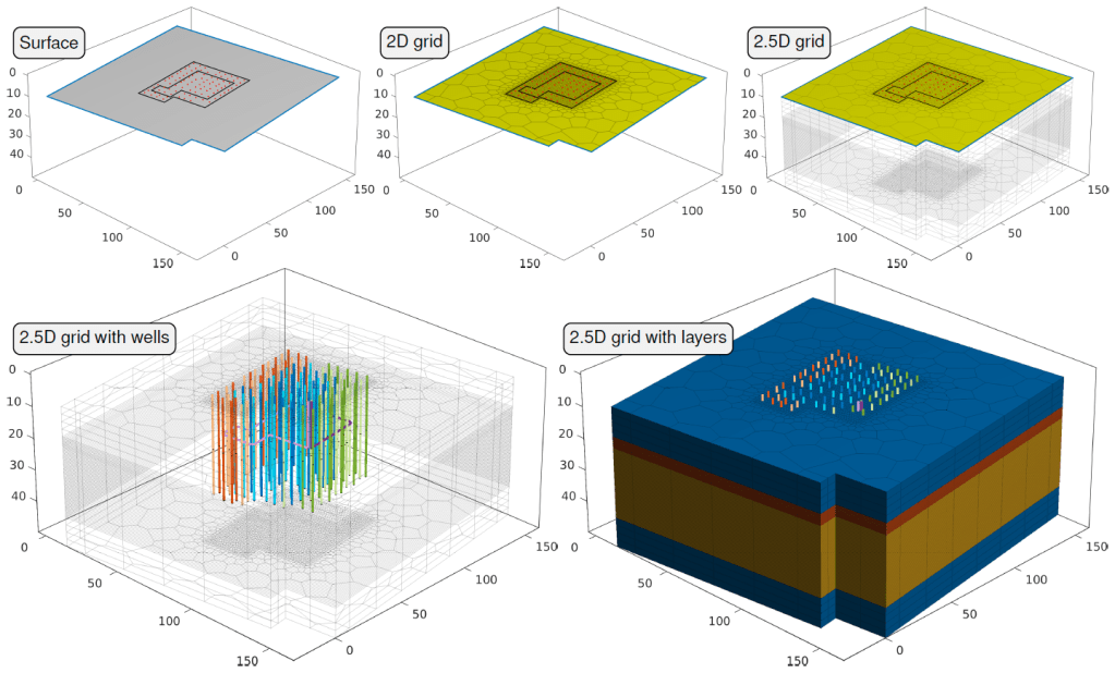 Construction of a 2.5D Voronoi grid for a thermal battery with 100 wells and multiple fractures.